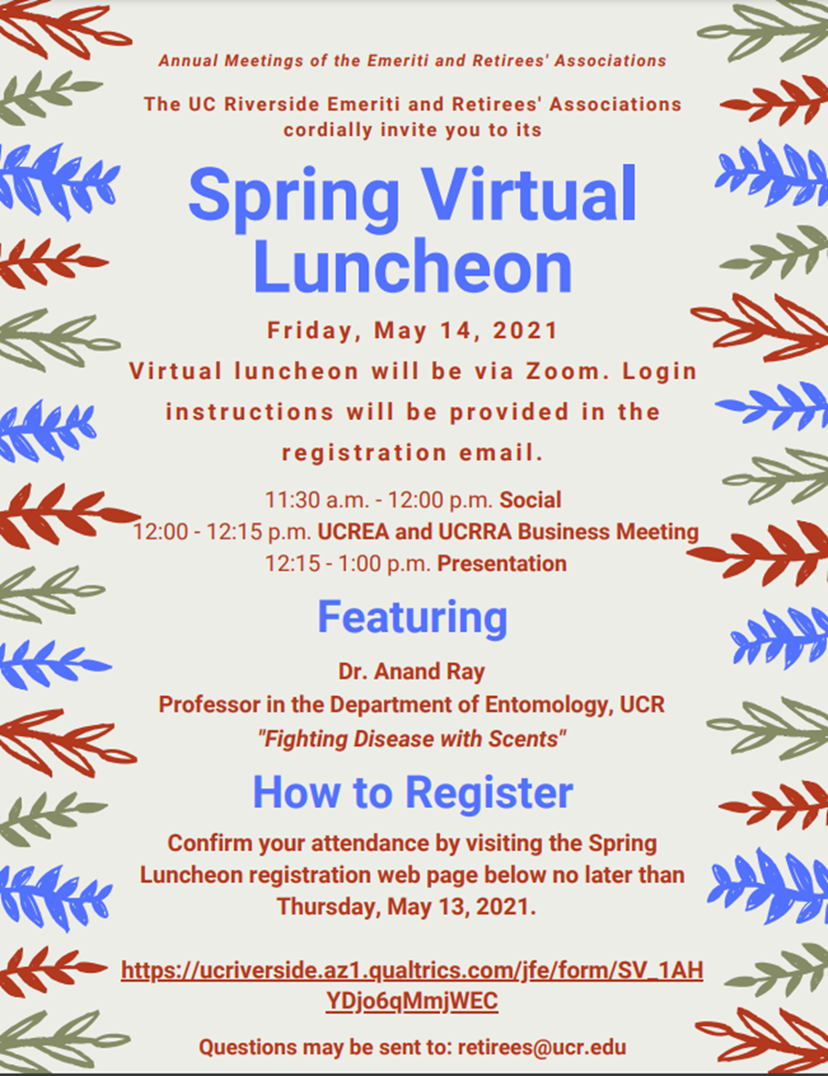 The UCR Retirees' and Emeriti Associations invites you to attend their virtual Spring Luncheon on Friday, May 14, 2021 from 11:30 a.m. - 1:00 p.m. We are excited to announce that Dr. Anand Ray, Professor of Entomology will give an online presentation titled, "Fighting Disease with Scents".