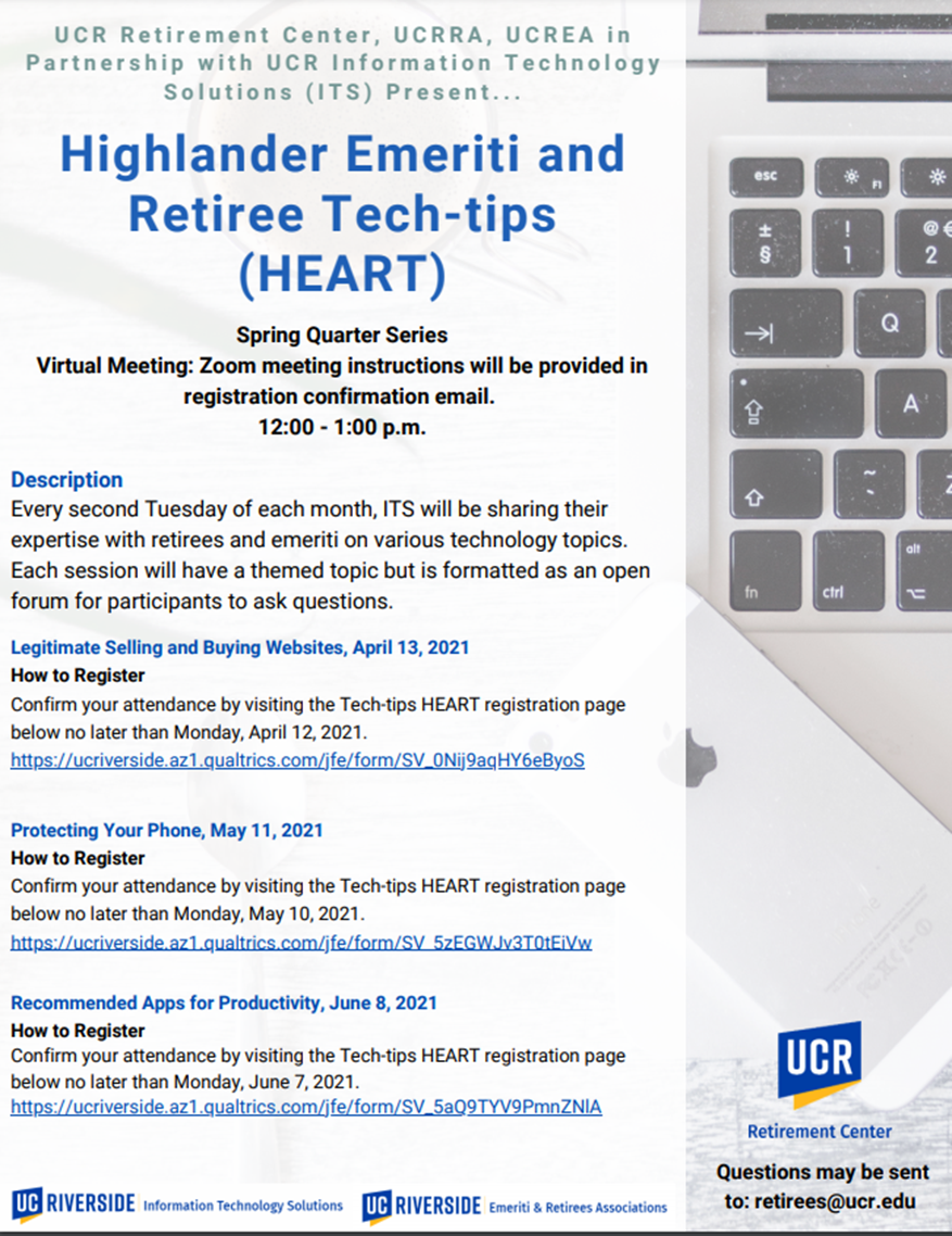 This is a friendly reminder that you are invited to join tomorrow's Tech-tips HEART session on - Protecting Your Phone. In partnership with UCR's Information Technology Solutions (ITS), ITS representatives will be on hand to lead these sessions and provide a question and answer session for retirees and emeriti to have any technology questions answered.