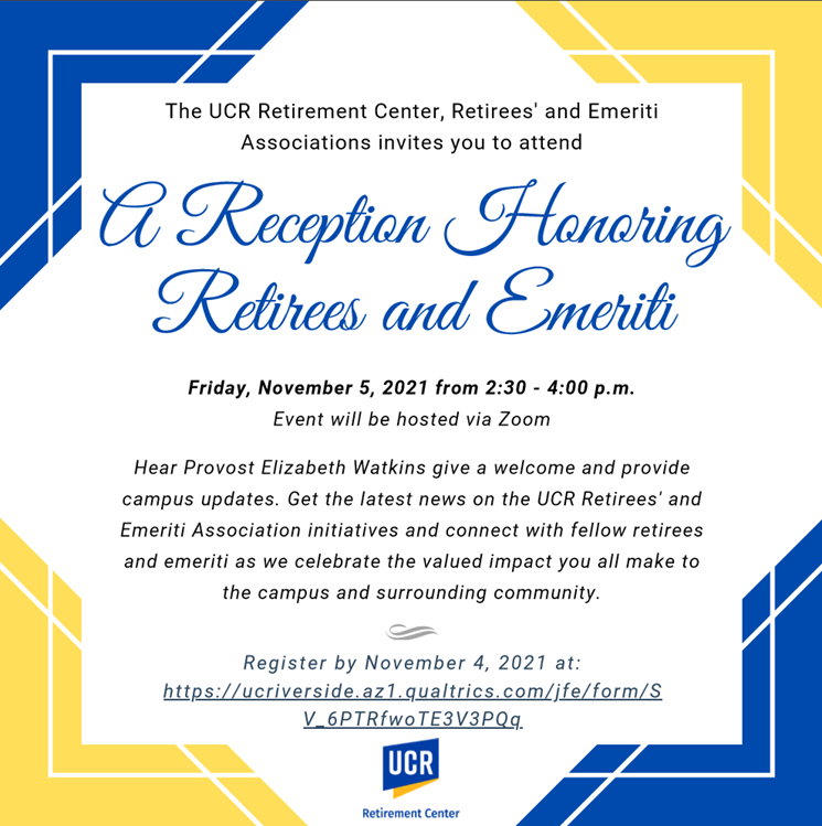 The UCR Retirement Center, Retirees' and Emeriti Associations cordially invites retirees and emeriti to an online reception honoring and celebrating the valuable contributions made to the campus and surrounding community on Friday, November 5, 2021 from 2:30 - 4:00 p.m. The legacy of the UCR retiree and emeriti community does not go unnoticed and we look forward to celebrating the hard work and dedication at this virtual event via Zoom.