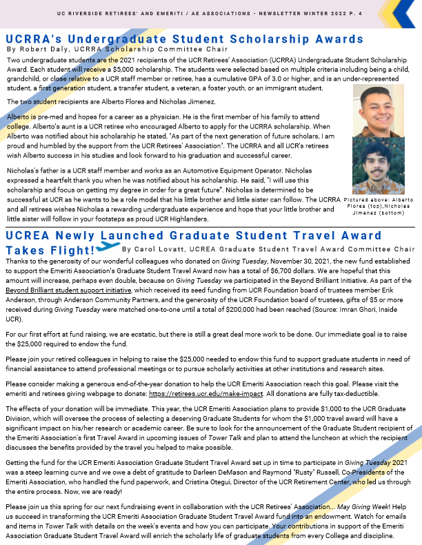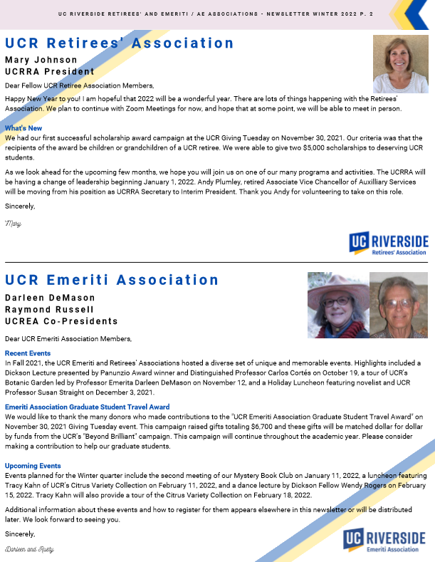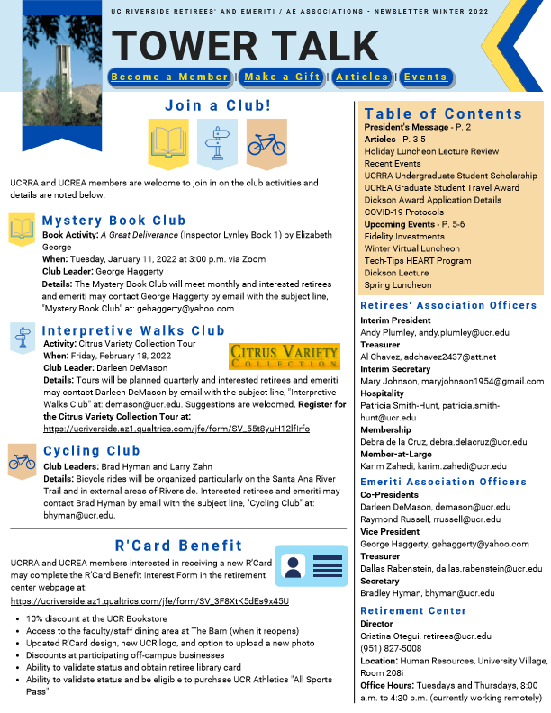 Please click on the attached document to view the UCR Emeriti and Retirees' 2022 Winter Tower Talk Newsletter. Included are clickable links to help navigate through the relevant content in the newsletter. Below is a pictured view of what is included.