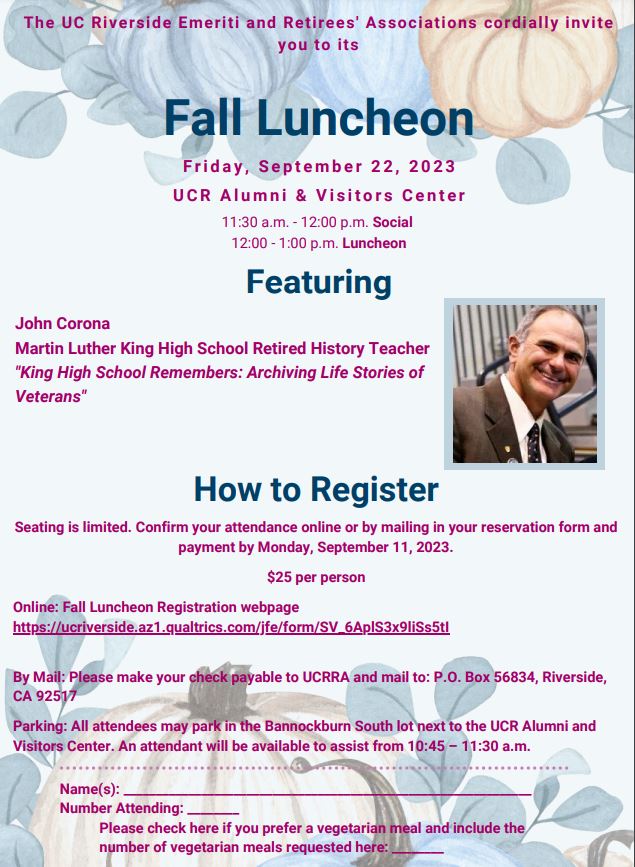 The UCR Retirees’ and Emeriti Associations invites you to attend their in-person Fall Luncheon on Friday, September 22, 2023 from 11:30 a.m. – 1:00 p.m. in the Alumni & Visitors Center at UCR. We have a special presentation from John Corona, a retired High School Teacher of Martin Luther King Highschool who will share about the King High School Remembers program and their work on “Archiving Life Stories of Veterans”.