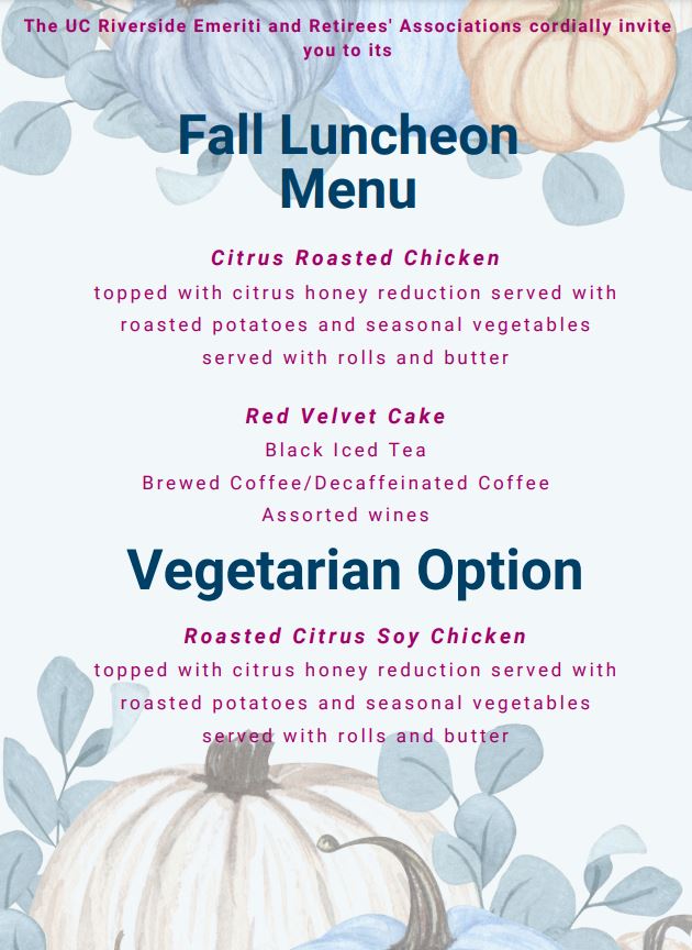 The luncheon will begin with a social half hour starting at 11:30 a.m. followed by the guest speaker presentation which will begin at 12:00 p.m. The UCR Retirees’ (UCRRA) and Emeriti (UCREA) Associations will also be sharing association announcements. Lunch will be provided and the cost of entry is $25 per person.