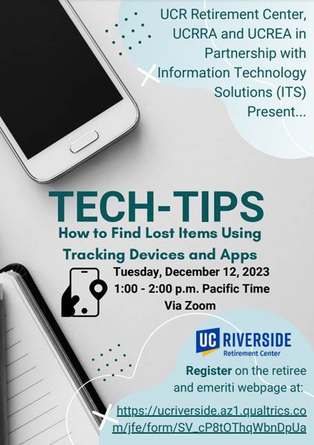 Retirees and Emeriti are invited to join the Tech-tips HEART Program, How to Find Lost Items Using Tracking Devices and Apps online session on Tuesday, December 12, 2023 from 1:00 – 2:00 p.m. Pacific Time. In partnership with UCR’s Information Technology Solutions (ITS), ITS representatives will be on hand to lead these sessions and provide a question and answer session for retirees and emeriti to have any technology questions answered.