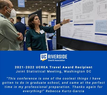 As we plan for UCR’s Give Day on Thursday, April 6, 2023, we want to take a look back at the progress we have made together in supporting UCR graduate students through the UCREA Graduate Student Travel Award. In 2021, our association created the UCREA Graduate Student Travel Award which provides $1,500 toward the expenses of domestic travel, or $2,000 to defray the cost of an international trip. In Spring 2022, Ph.D. candidate Rebecca Kurtz-Garcia became the first graduate student to receive a travel award to aid her in traveling to the Joint Statistical Meeting in Washington, D.C. to make a presentation on her research.