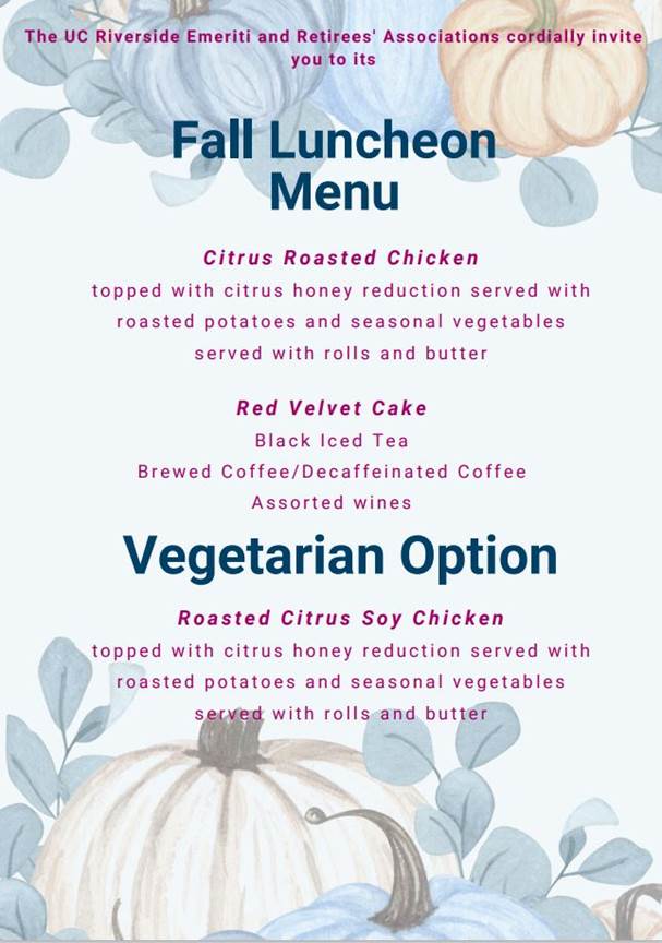 The luncheon will begin with a social half hour starting at 11:30 a.m. followed by the guest speaker presentation which will begin at 12:00 p.m. The UCR Retirees' (UCRRA) and Emeriti (UCREA) Associations will also be sharing association announcements. Lunch will be provided and the cost of entry is $25 per person.