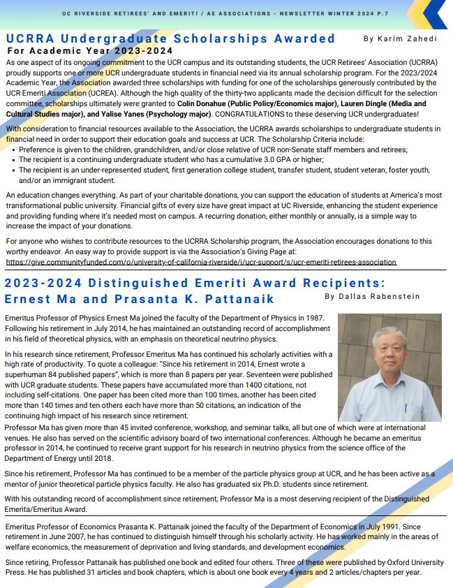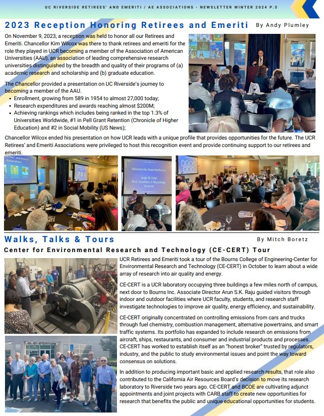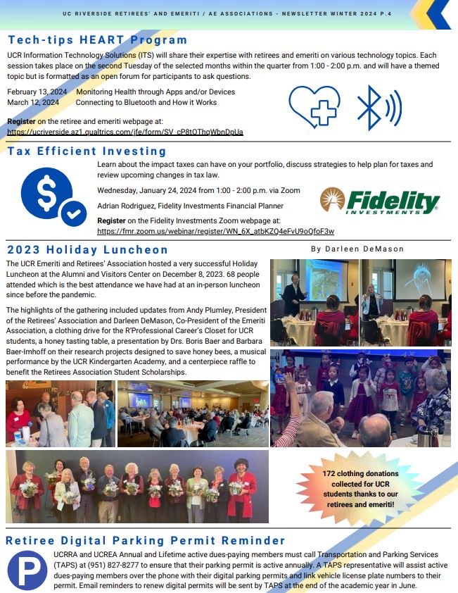 Please click on the attached document to view the UCR Emeriti and Retirees' 2024 Winter Tower Talk Newsletter. Included are clickable links to help navigate through the relevant content in the newsletter. Below is a pictured view of what is included.