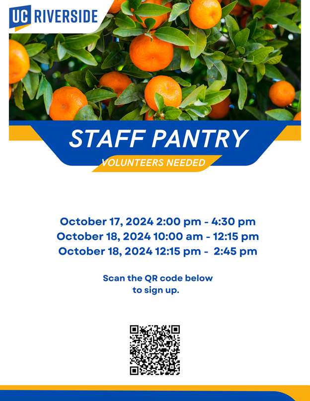 Central Human Resources and UCR Staff Assembly invites emeriti and retirees to volunteer and support the UCR Staff Pantry. Volunteer shifts are available prior to and during the Staff Pantry event dates to assist with pantry preparations, set up, distribution and clean up. Location of the Staff Pantry is on the UCR campus in Glen Mor C001 and can be found on the Glen Mor Community Map under section C at: https://auxiliarydocs.ucr.edu/hospitality/map-of-glen-mor.pdf.