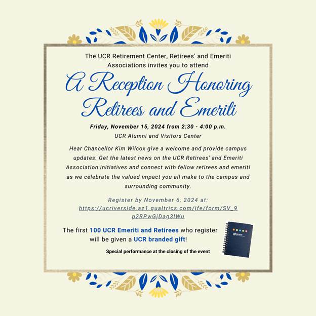 The UCR Retirement Center, Retirees' and Emeriti Associations cordially invites retirees and emeriti to a reception honoring and celebrating the valuable contributions made to the campus and surrounding community on Friday, November 15, 2024 from 2:30 - 4:00 p.m at the UCR Alumni and Visitors Center. The legacy of the UCR retiree and emeriti community does not go unnoticed and we look forward to coming together to honor your hard work and dedication at this event.