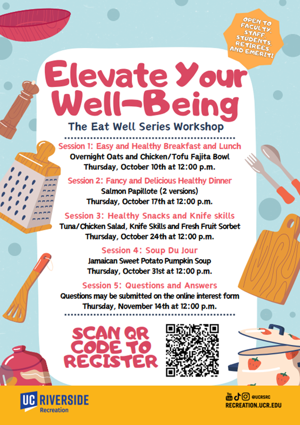 Emeriti and Retirees are invited to join the Eat Well Series Featuring Chef Val via Zoom organized in partnership with the UCR Wellness Program, UCR Student Recreation Center and UCR Retirement Center. This five-week virtual series will include Chef Val preparing food and cooking healthy recipes for all to see and learn from while answering questions from attendees.