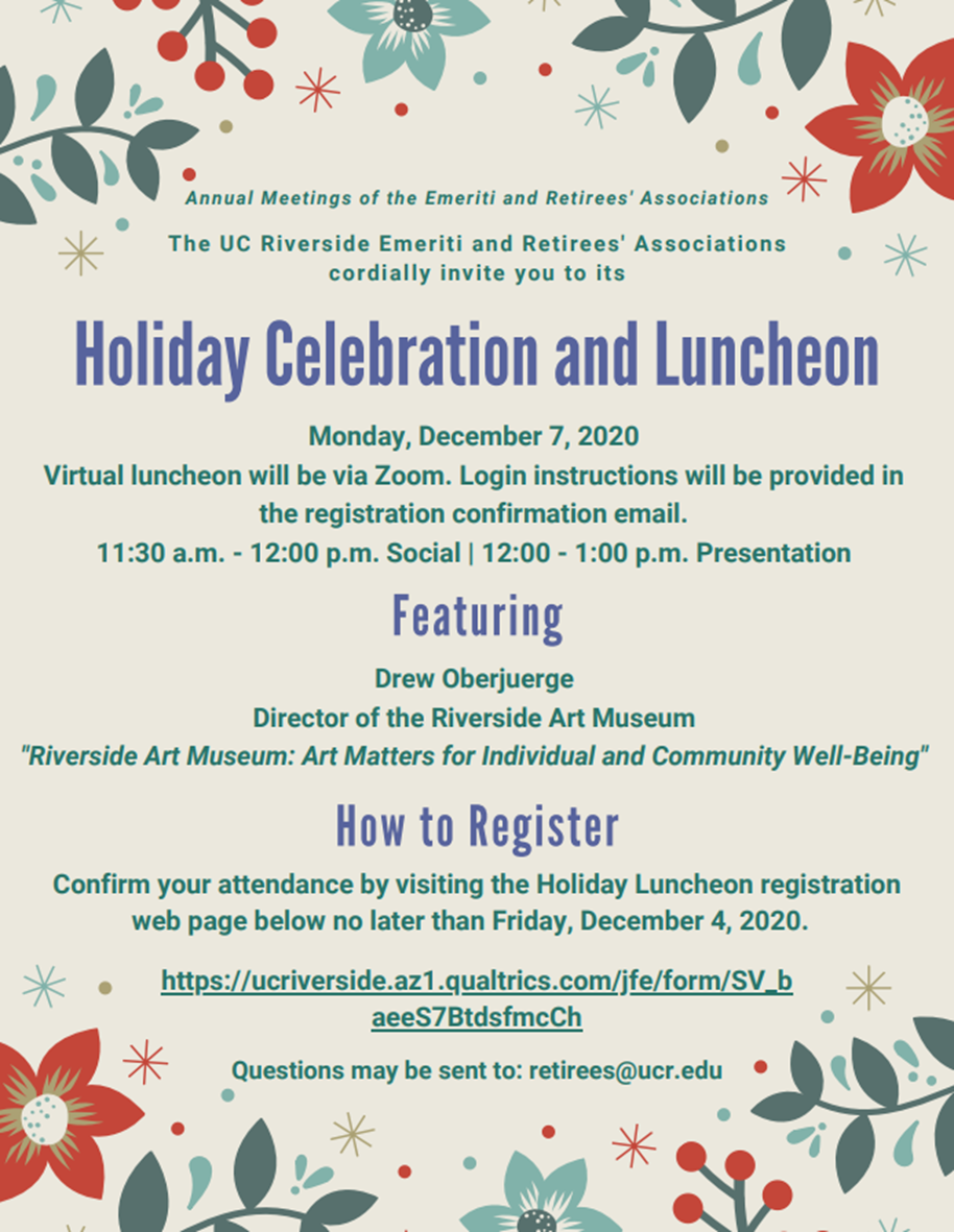 Please complete your registration before Friday, December 4, 2020 by visiting the UCR Emeriti & Retirees' Associations Event Registration webpage at: