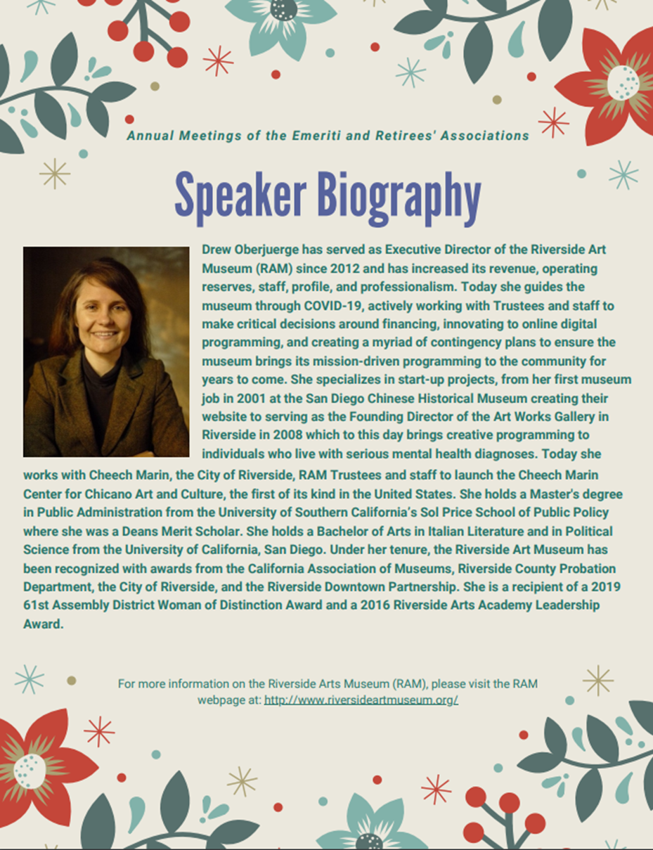 This message serves as a friendly reminder to participate in the online presentation titled, "Riverside Arts Museum: Art Matters for Individual and Community Well-Being" presented by Drew Oberjuerge, Director of the Riverside Arts Museum on Monday, December 7, 2020 from 11:30 a.m. - 1:00 p.m. Since in-person events and gatherings are not permitted on campus at this time, we invite you to join us for this event virtually.