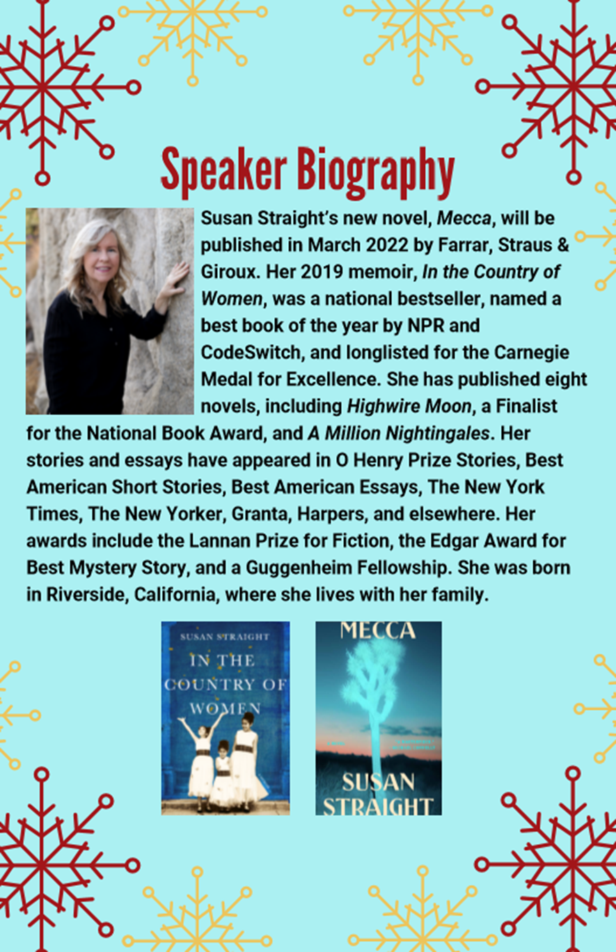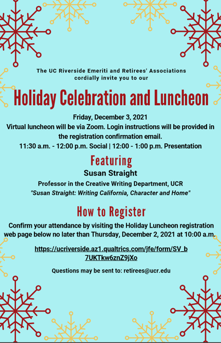 This is a friendly reminder that the UCR Retirees’ and Emeriti Associations invites you to attend their virtual Holiday Luncheon on Friday, December 3, 2021 from 11:30 a.m. – 1:00 p.m. We are excited to announce that Dr. Susan Straight, Professor in the UCR Creative Writing Department will give an online presentation titled, “Susan Straight: Writing California, Character and Home”.