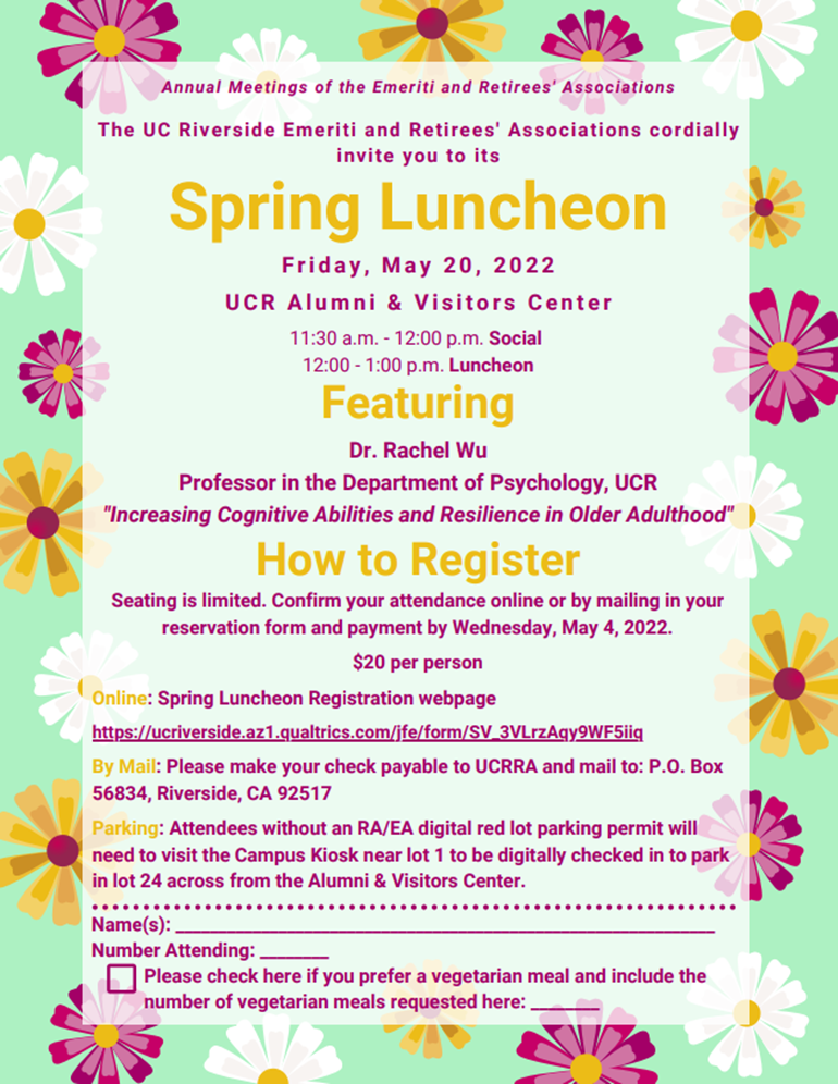 The UCR Retirees’ and Emeriti Associations invites you to attend their in-person Spring Luncheon on Friday, May 20, 2022 from 11:30 a.m. – 1:00 p.m. in the Alumni & Visitors Center at UCR. We are excited to announce that Dr. Rachel Wu, Professor in the Psychology Department will give a presentation titled, “Increasing Cognitive Abilities and Resilience in Older Adulthood”.
