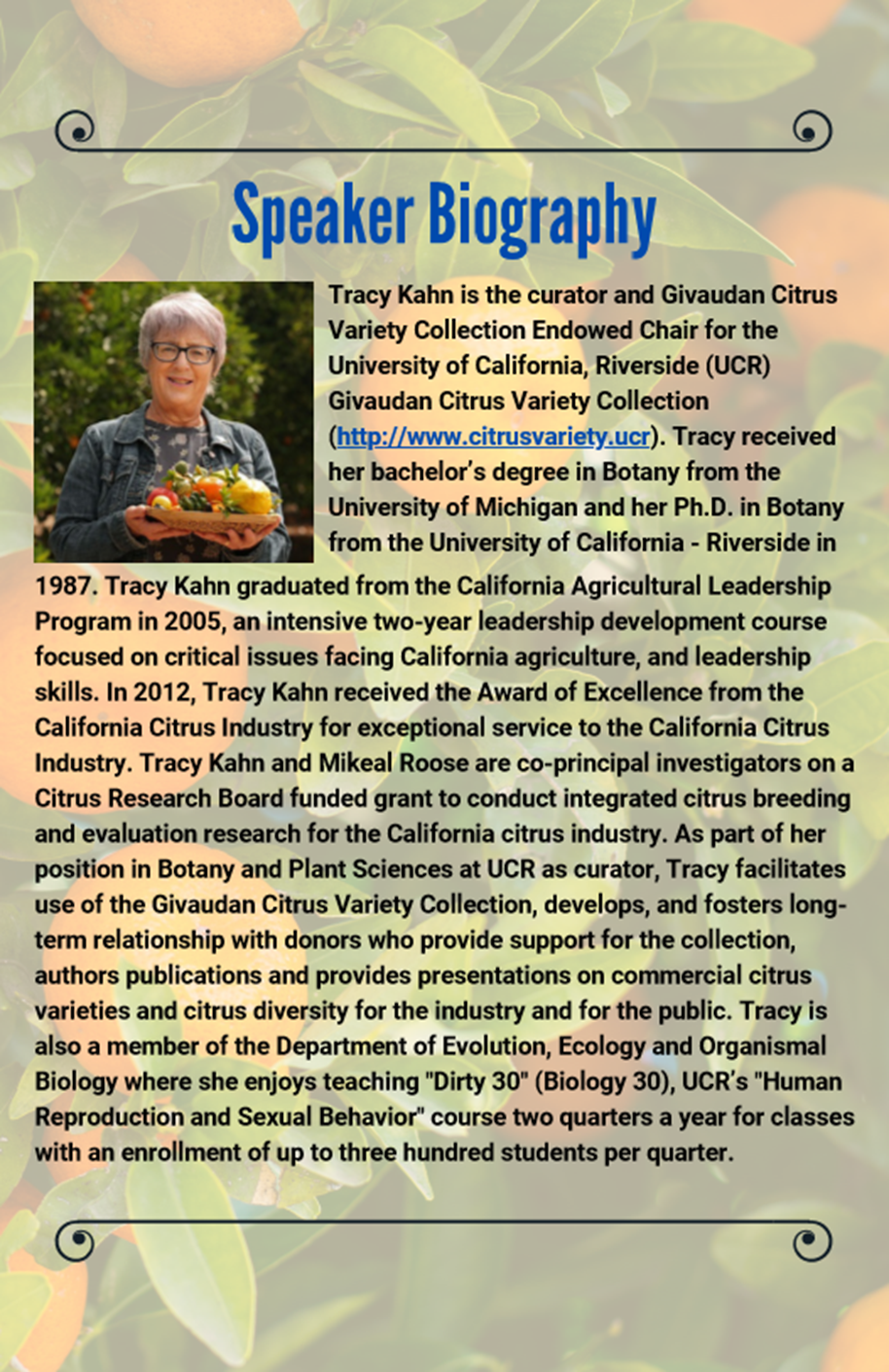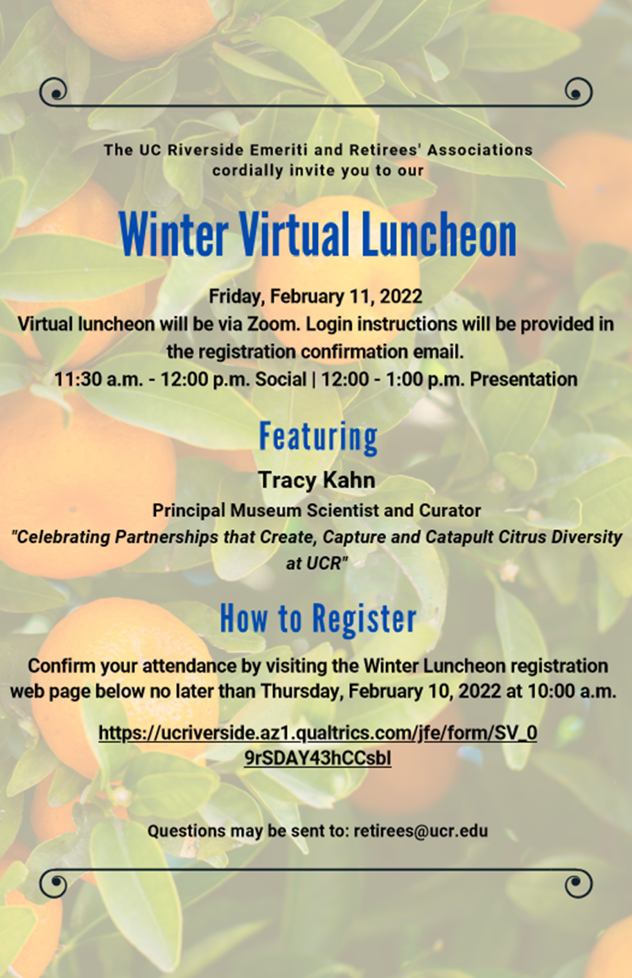 This is a friendly reminder that the UCR Retirees’ and Emeriti Associations invites you to attend their virtual Winter Luncheon on Friday, February 11, 2022 from 11:30 a.m. – 1:00 p.m. We are excited to announce that Dr. Tracy Kahn, Principal Museum Scientist and Curator will give an online presentation titled, “Celebrating Partnerships that Create, Capture and Catapult Citrus Diversity at UCR”.