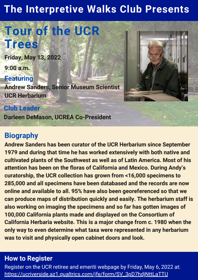 UCR emeriti and retirees are invited to the Interpretive Walks Club Activity: Tour of the UCR Trees led by Senior Museum Scientist and UCR Herbarium, Andrew Sanders on Friday, May 13, 2022 at 9:00 a.m. Space is limited and information on the meeting location for the tour will be provided in a confirmation email upon registering. Make sure to wear good walking shoes and a hat, bring water and wear clothing appropriate for the weather.