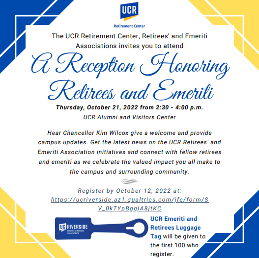 The UCR Retirement Center, Retirees' and Emeriti Associations cordially invites retirees and emeriti to a reception honoring and celebrating the valuable contributions made to the campus and surrounding community on Thursday, October 21, 2022 from 2:30 - 4:00 p.m at the UCR Alumni and Visitors Center. The legacy of the UCR retiree and emeriti community does not go unnoticed and we look forward to celebrating the hard work and dedication at this virtual event.