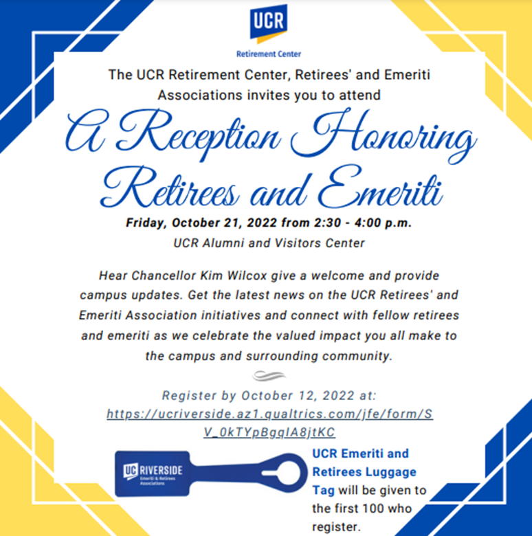 The UCR Retirement Center, Retirees' and Emeriti Associations cordially invites retirees and emeriti to a reception honoring and celebrating the valuable contributions made to the campus and surrounding community on Friday, October 21, 2022 from 2:30 - 4:00 p.m at the UCR Alumni and Visitors Center. The legacy of the UCR retiree and emeriti community does not go unnoticed and we look forward to celebrating the hard work and dedication at this virtual event.