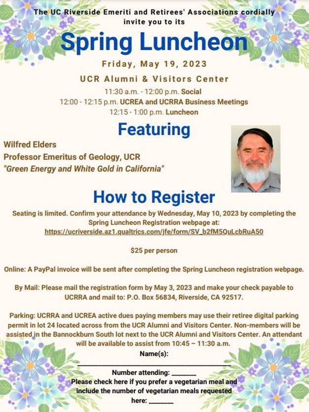 The UCR Retirees’ and Emeriti Associations invites you to attend their in-person Spring Luncheon on Friday, May 19, 2023 from 11:30 a.m. – 1:00 p.m. in the Alumni & Visitors Center at UCR. We are excited to announce that UCR Professor Emeritus of the Geology Department, Wilfred Elders will give a presentation titled, “Green Energy and White Gold in California”.