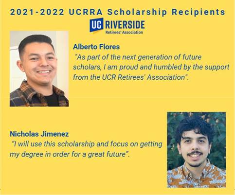As we plan for UCR’s Give Day on Thursday, April 6, 2023, we want to take a look back at the progress we have made together in supporting UCR undergraduate students through the UCRRA Undergraduate Student Scholarship. In 2021, our association awarded two undergraduate students Nicholas Jimenez and Alberto Flores each with a $5,000 scholarship to aid them in achieving their educational goals.