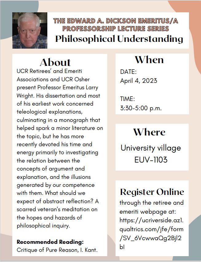 Please join us for the upcoming Edward A. Dickson Emeritus/a Lecture Talk Series. Each year three retired UCR faculty are awarded Edward A. Dickson Professorships to support their research, teaching, or public service activities. In the year following their awards, Dickson Professors give public presentations of their work sponsored jointly by the UCR Emeriti Association and Retirees' Association.