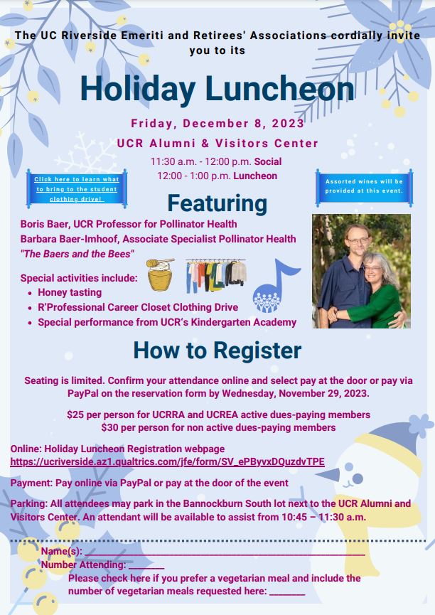 The luncheon will begin with a social half hour starting at 11:30 a.m. followed by the guest speaker presentation which will begin at 12:00 p.m. The UCR Retirees' (UCRRA) and Emeriti (UCREA) Associations will also be sharing association announcements. Lunch will be provided and assorted wines will be served.