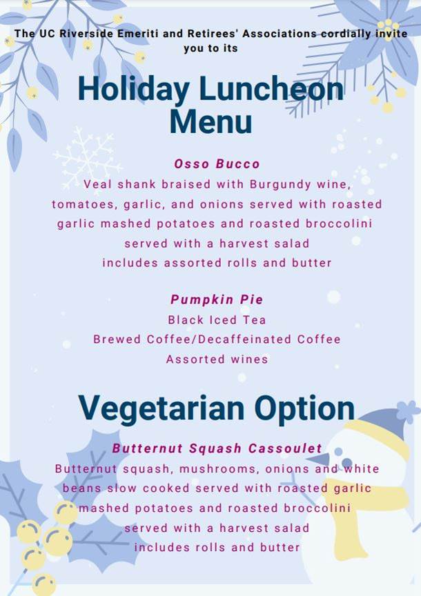 The UCR Retirees' and Emeriti Associations invites you to attend their in-person Holiday Luncheon on Friday, December 8, 2023 from 11:30 a.m. - 1:00 p.m. in the Alumni & Visitors Center at UCR.