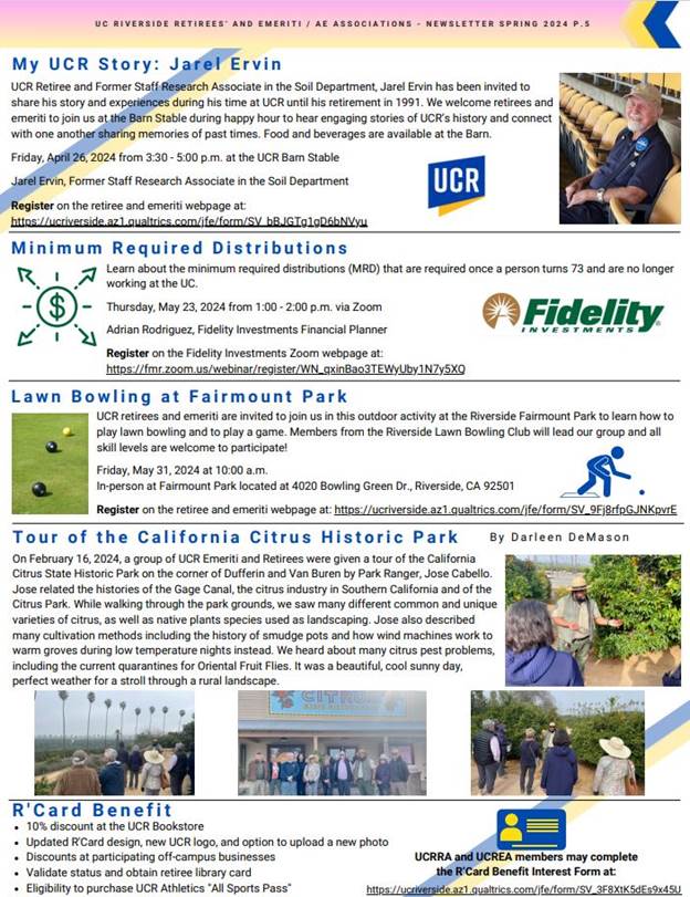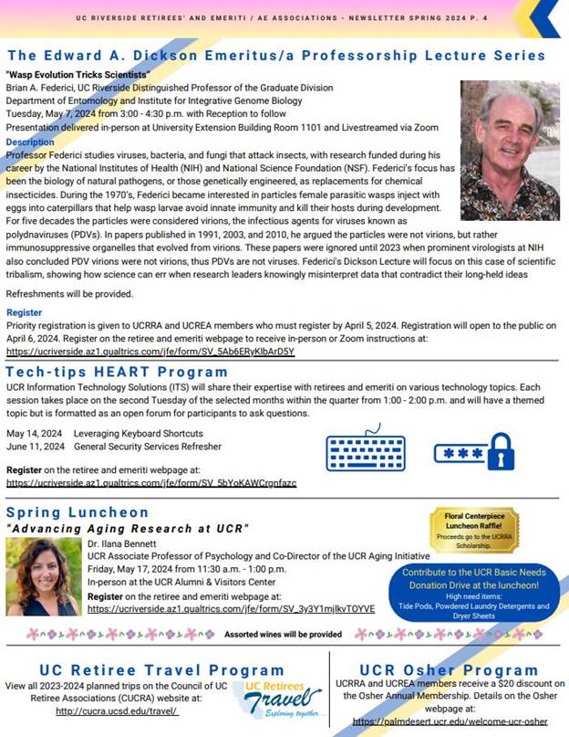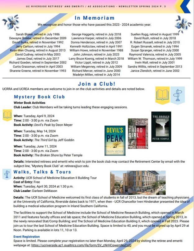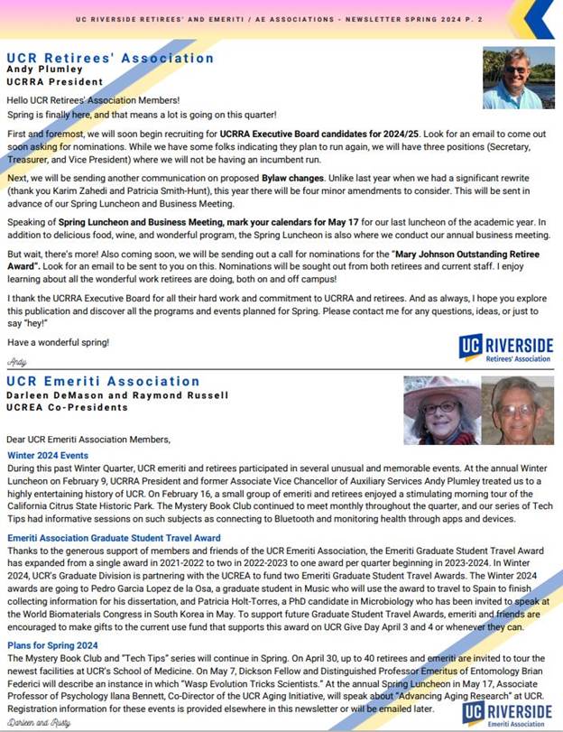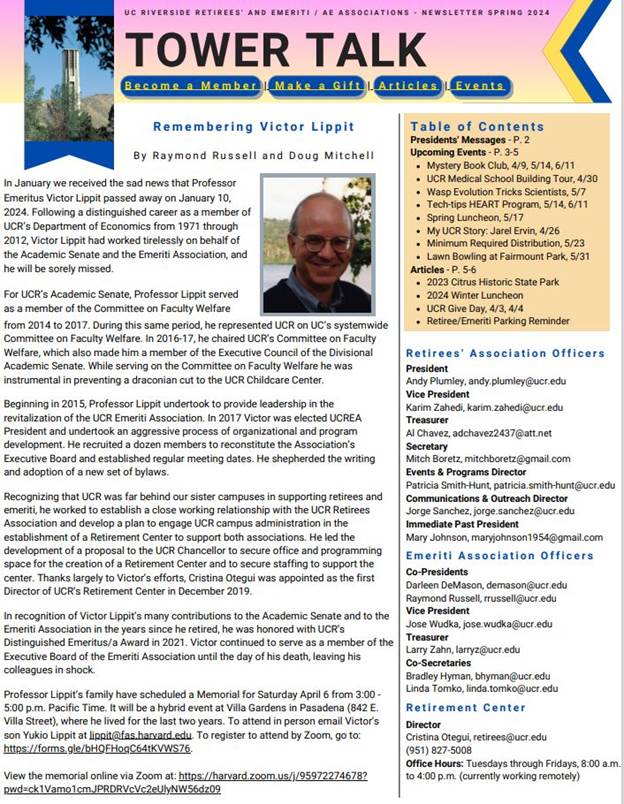 Please click on the attached document to view the UCR Emeriti and Retirees' 2024 Spring Tower Talk Newsletter. Included are clickable links to help navigate through the relevant content in the newsletter. Below is a pictured view of what is included.