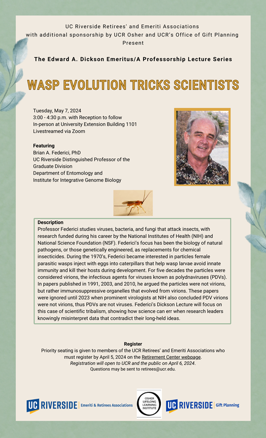 Re: Reminder: “Wasp Evolution Tricks Scientists” Dickson Presentation by Distinguished Professor Emeritus Brian A. Federici on May 7, 2024
