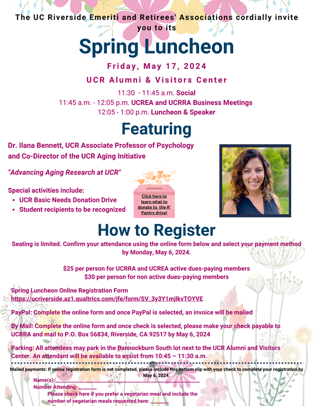 The UCR Retirees’ and Emeriti Associations invites you to attend their in-person Spring Luncheon on Friday, May 17, 2024 from 11:30 a.m. – 1:00 p.m. in the Alumni & Visitors Center at UCR. We are thrilled to have Associate Professor in Psychology and Co-Director of UCR’s Aging Initiative to present on “Advancing Aging Research at UCR”.