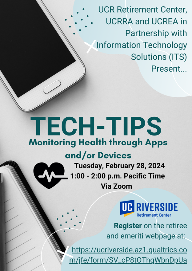 Retirees and Emeriti are invited to join the rescheduled Tech-tips HEART Program, Monitoring Health through Apps and/or Devices online session today, Tuesday, February 28, 2024 from 1:00 - 2:00 p.m. Pacific Time. In partnership with UCR's Information Technology Solutions (ITS), ITS representatives will be on hand to lead these sessions and provide a question and answer session for retirees and emeriti to have any technology questions answered.