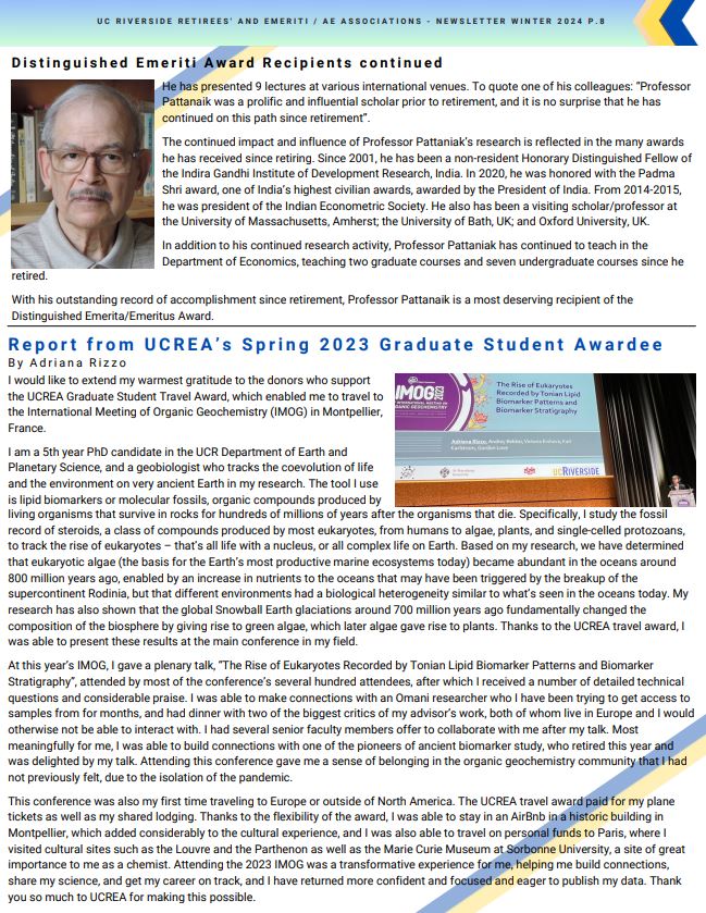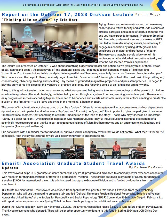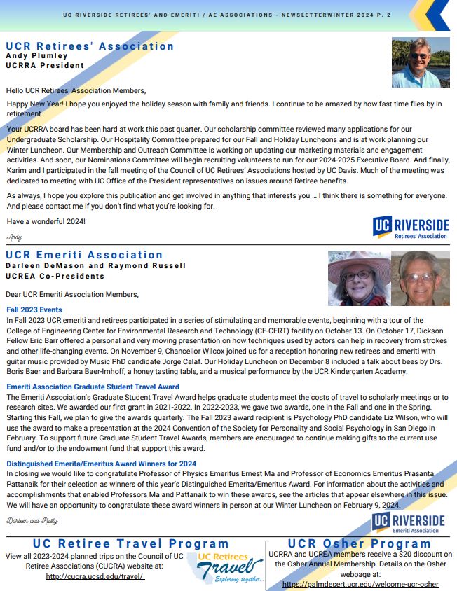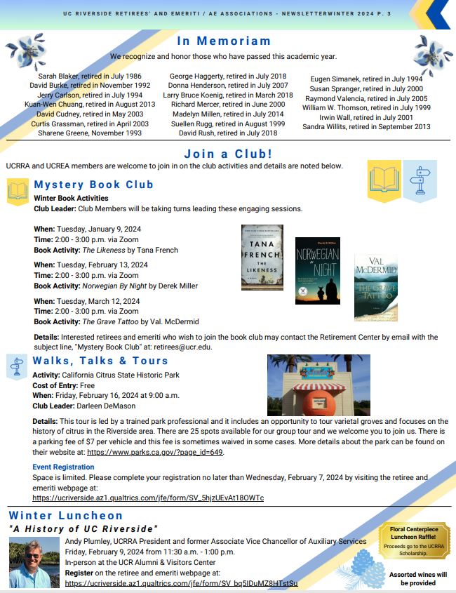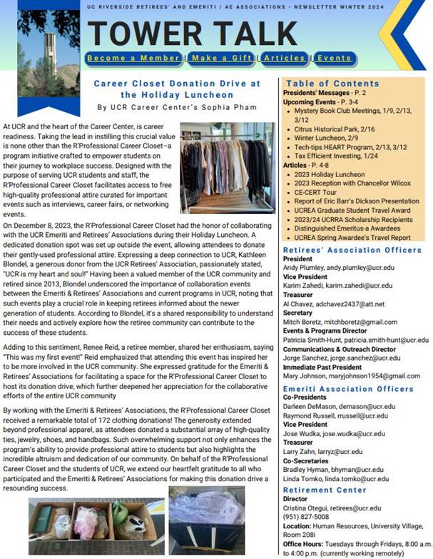 Please click on the attached document to view the UCR Emeriti and Retirees' 2024 Winter Tower Talk Newsletter. Included are clickable links to help navigate through the relevant content in the newsletter. Below is a pictured view of what is included.