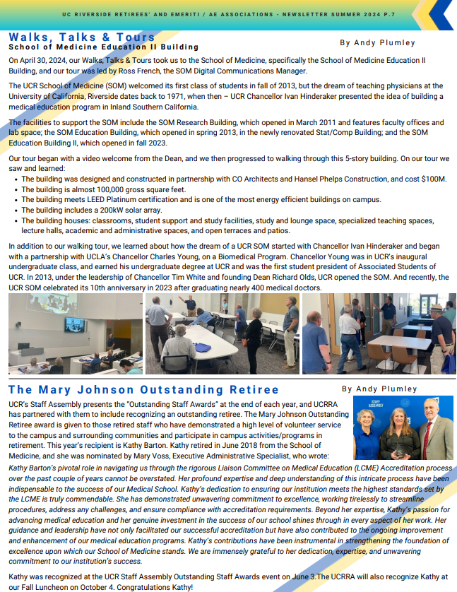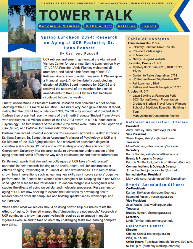 Please click on the attached document to view the UCR Emeriti and Retirees' 2024 Summer Tower Talk Newsletter. Included are clickable links to help navigate through the relevant content in the newsletter. Below is a pictured view of what is included.