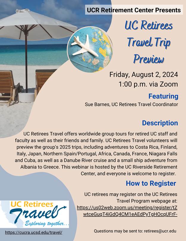 [UCRRA] Register for the UC Retirees Travel Trip Preview Featuring Travel Coordinator, Sue Barnes | August 2, 2024