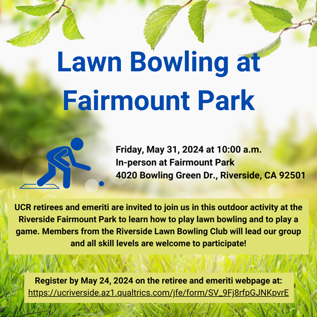 UCR retirees and emeriti are invited to join us in this outdoor activity at the Riverside Fairmount Park to learn how to play lawn bowling and to play a game. Members from the Riverside Lawn Bowling Club will lead our group and all skill levels are welcome to participate!