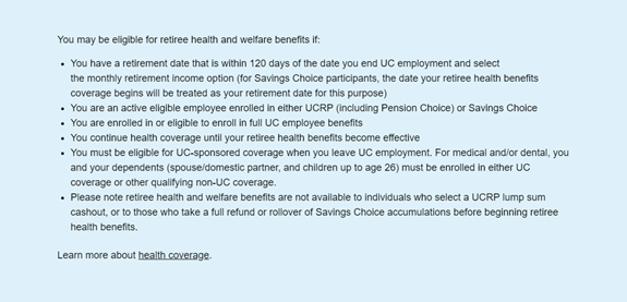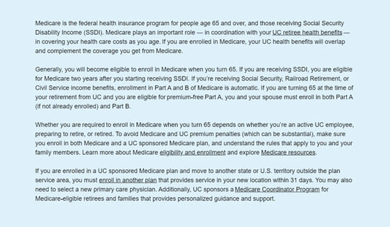 · Details about your retiree benefits (alphabetical in the list, under “Medicare and health coverage guides from the RASC”) at: https://ucnet.universityofcalifornia.edu/retirees/understanding-your-retiree-benefits/details-retiree-benefits/