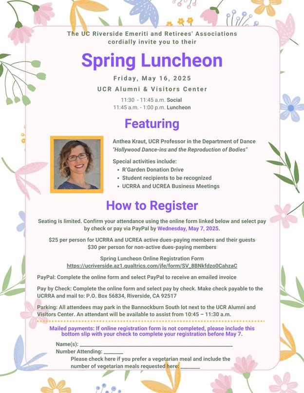 The UCR Retirees’ and Emeriti Associations invites you to attend their in-person Spring Luncheon on Friday, May 16 from 11:30 a.m. – 1:00 p.m. in the Alumni & Visitors Center at UCR. We are thrilled to have UCR Professor in the Dance Department, Anthea Kraut to present on “Hollywood Dance-ins and the Reproduction of Bodies.”