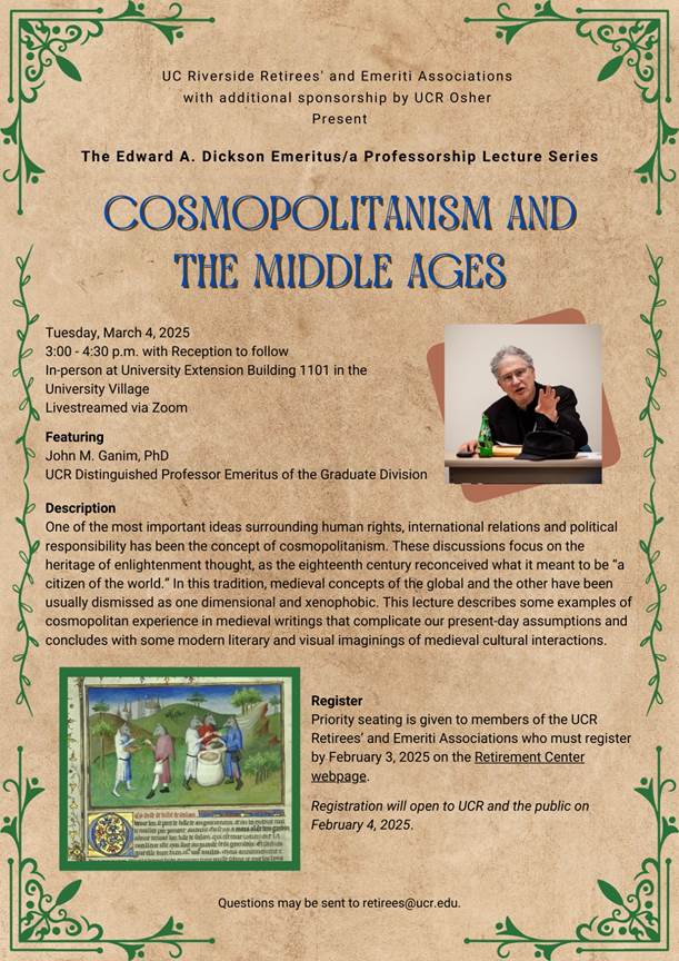 [UCRRA] “Cosmopolitanism and the Middle Ages” Dickson Presentation by UCR Professor Emeritus John Ganim on March 4, 2025