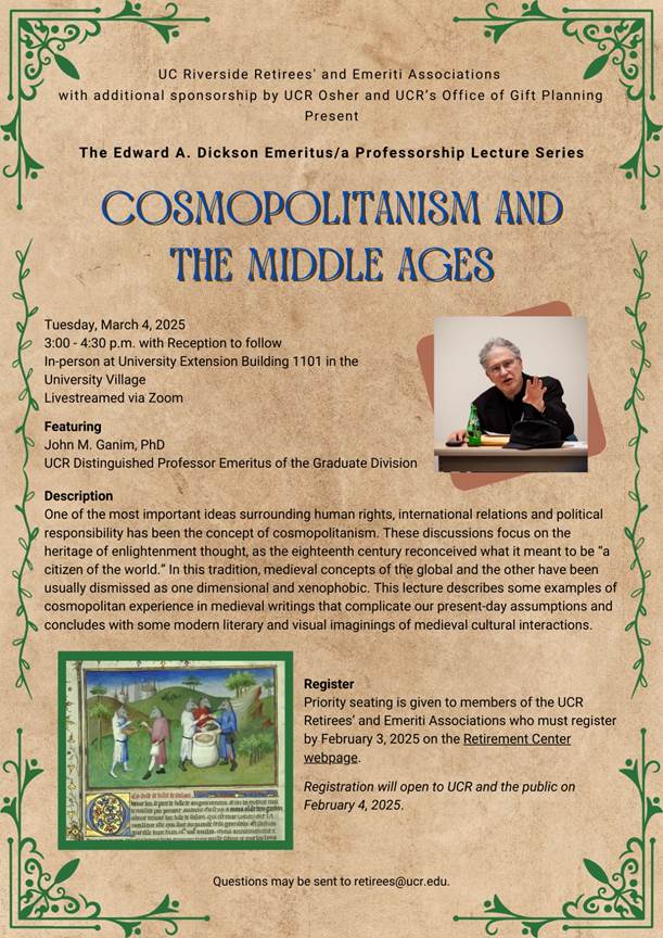 Re: Reminder: “Cosmopolitanism and the Middle Ages” Dickson Presentation by UCR Professor Emeritus John Ganim on March 4, 2025
