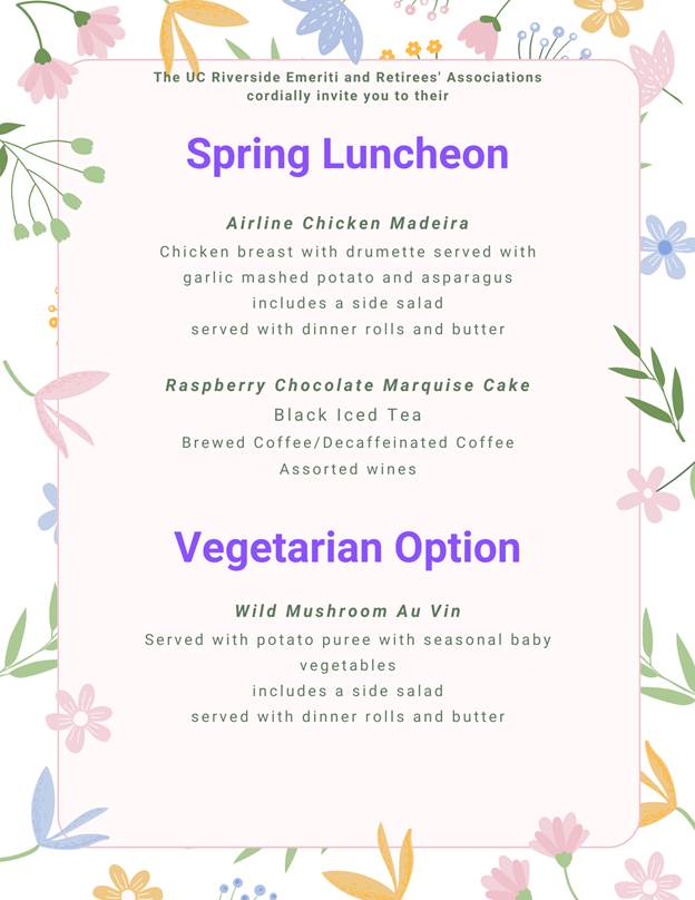 · Online: Complete the Spring Luncheon Registration webpage at: https://ucriverside.az1.qualtrics.com/jfe/form/SV_8BNkfdzo0CahzaC