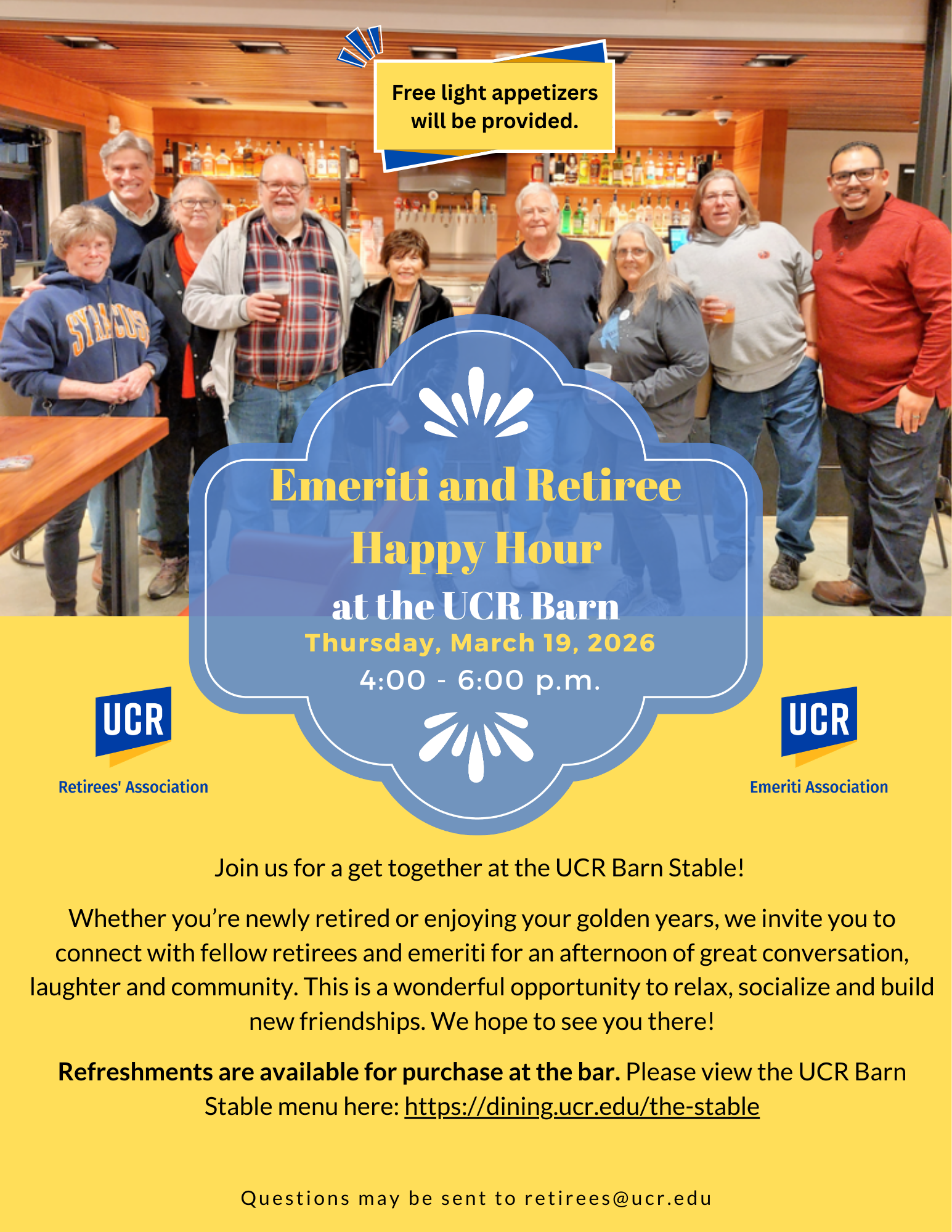 Join Us tomorrow 3/19! Emeriti and Retiree Happy Hour at the UCR Barn Stable