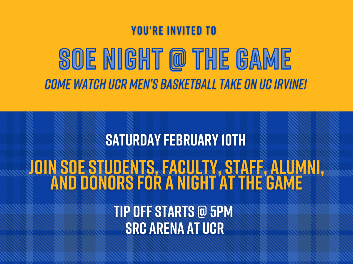 Education majors and minors: please join the SOE community for SOE Night at the Game this Saturday, Feb. 10 at 5 PM! This will be a great opportunity to connect with SOE faculty, alumni, staff, and other students. We will be giving out UCR pompoms, foam fingers, and there will be chance to play in a few half time games with Dean Joi A. Spencer!