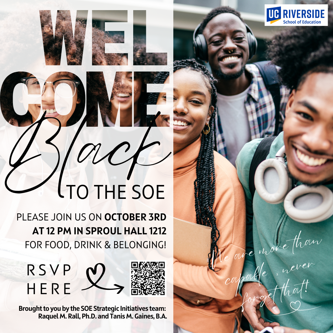 Please join us for the second annual Welcome Black to the SOE event, dedicated to fostering meaningful connections among Black students, staff, and faculty. This event, the first of three in our 'Black in the SOE' series for the 2024-2025 school year, is a great opportunity to reconnect and engage with our vibrant community. Lunch will be provided for all registered attendees. We saw many of you at this event last fall and hope you can join again. Please spread the word.