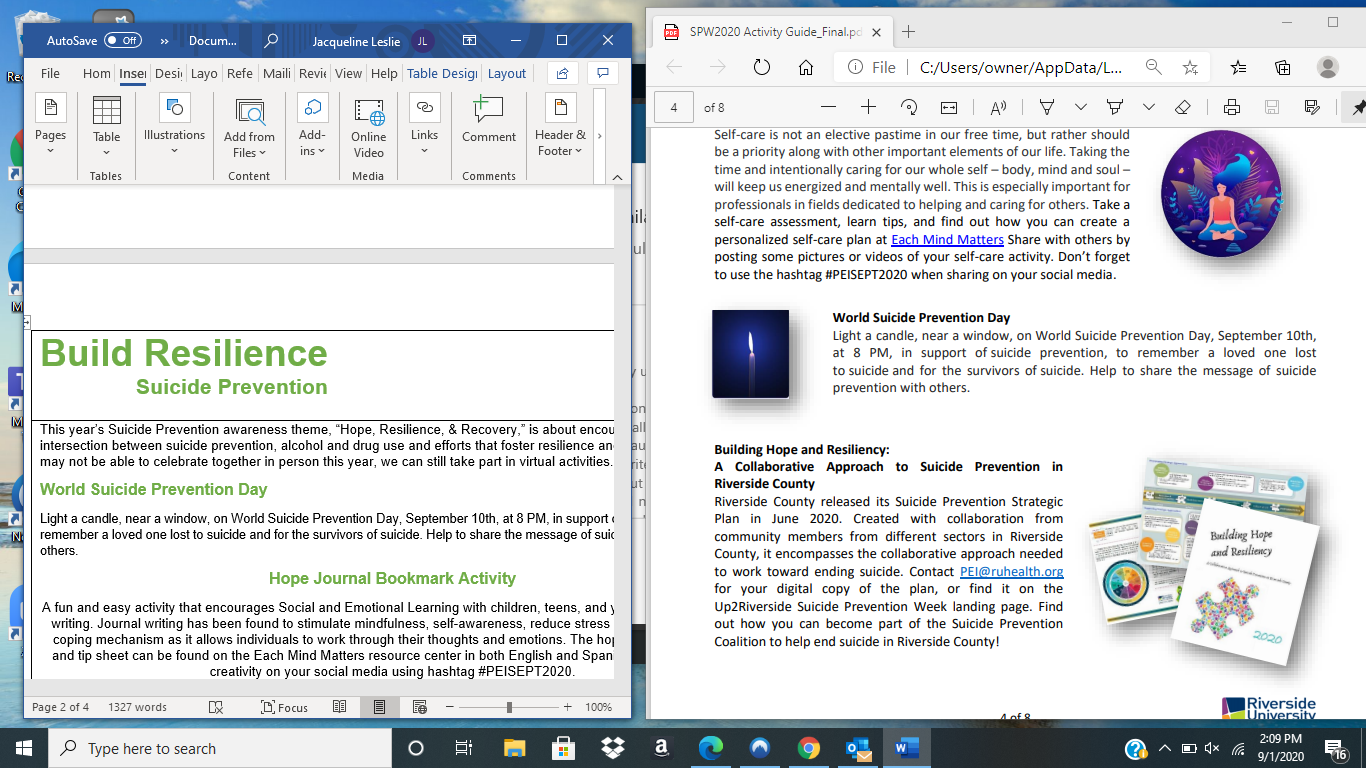 This year's Suicide Prevention awareness theme, "Hope, Resilience, & Recovery," is about encouraging the intersection between suicide prevention, alcohol and drug use and efforts that foster resilience and recovery. While we may not be able to celebrate together in person this year, we can still take part in virtual activities.