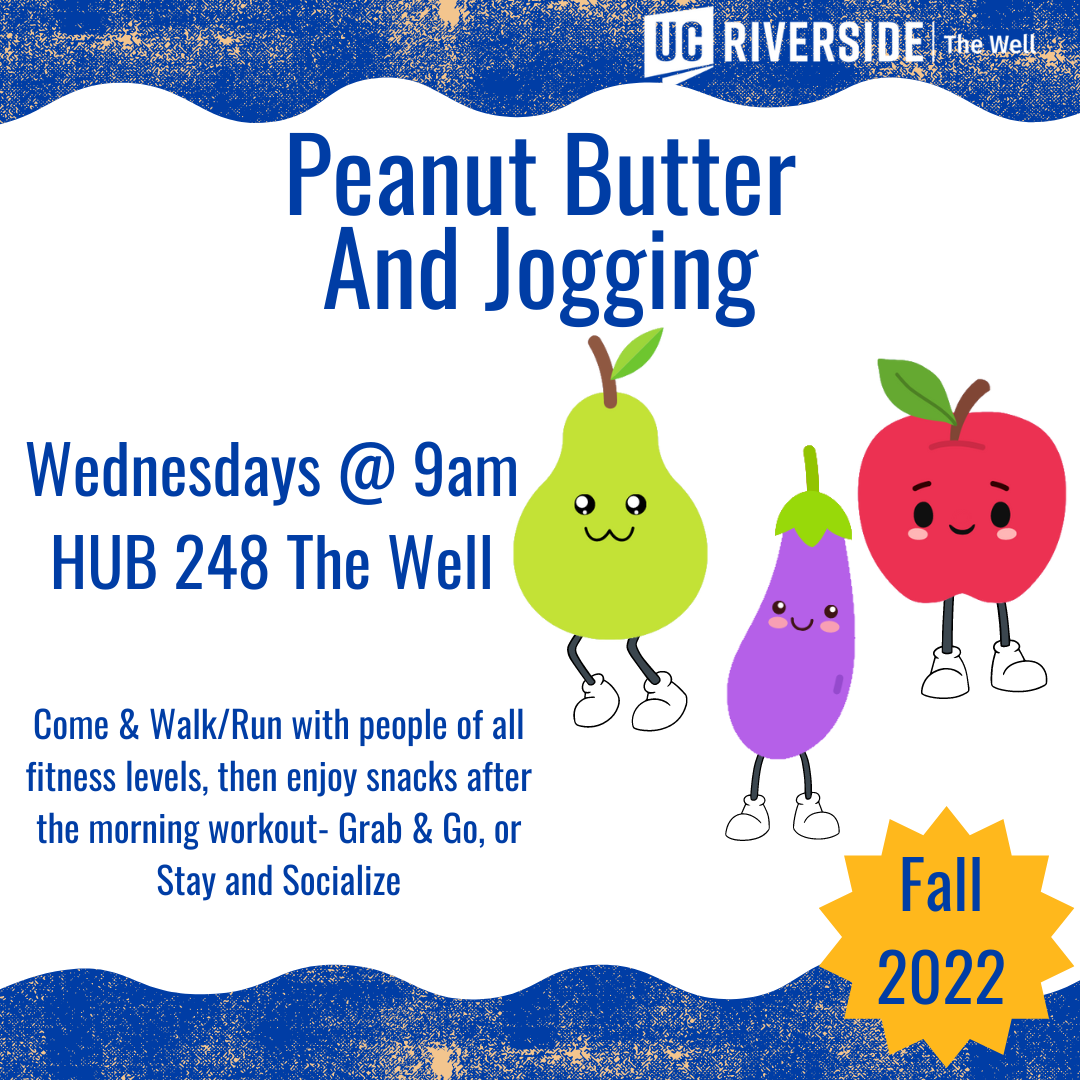 I also wanted to make you aware of The Well's Peanut Butter & Jogging (PB&J) program. This fun and relaxing running/walking program is offered weekly and is open to students, faculty, and staff. As we head into cooler Fall weather, this is the perfect opportunity to come out with some friends, get your steps in, and enjoy some fresh cool air.